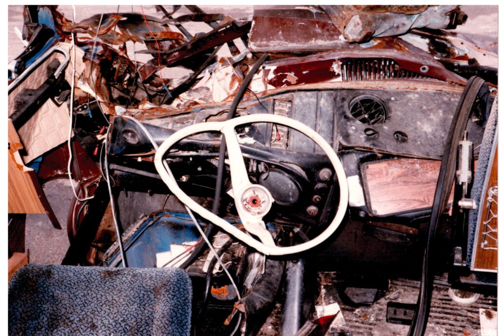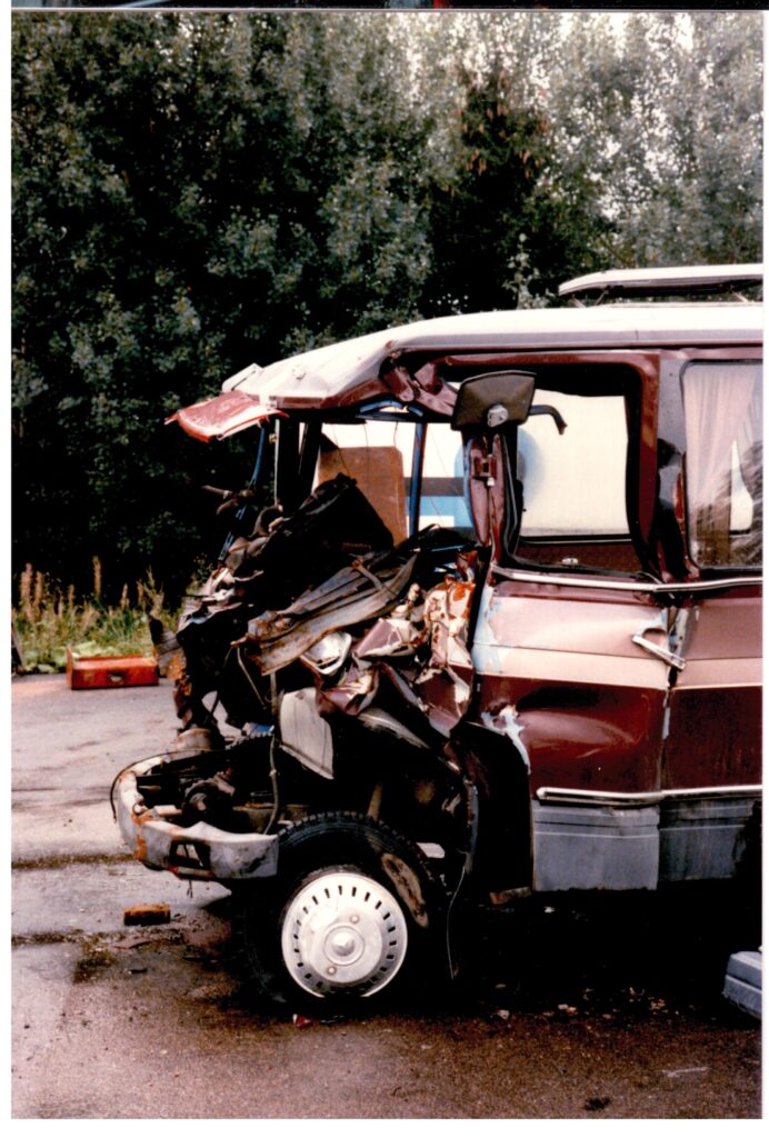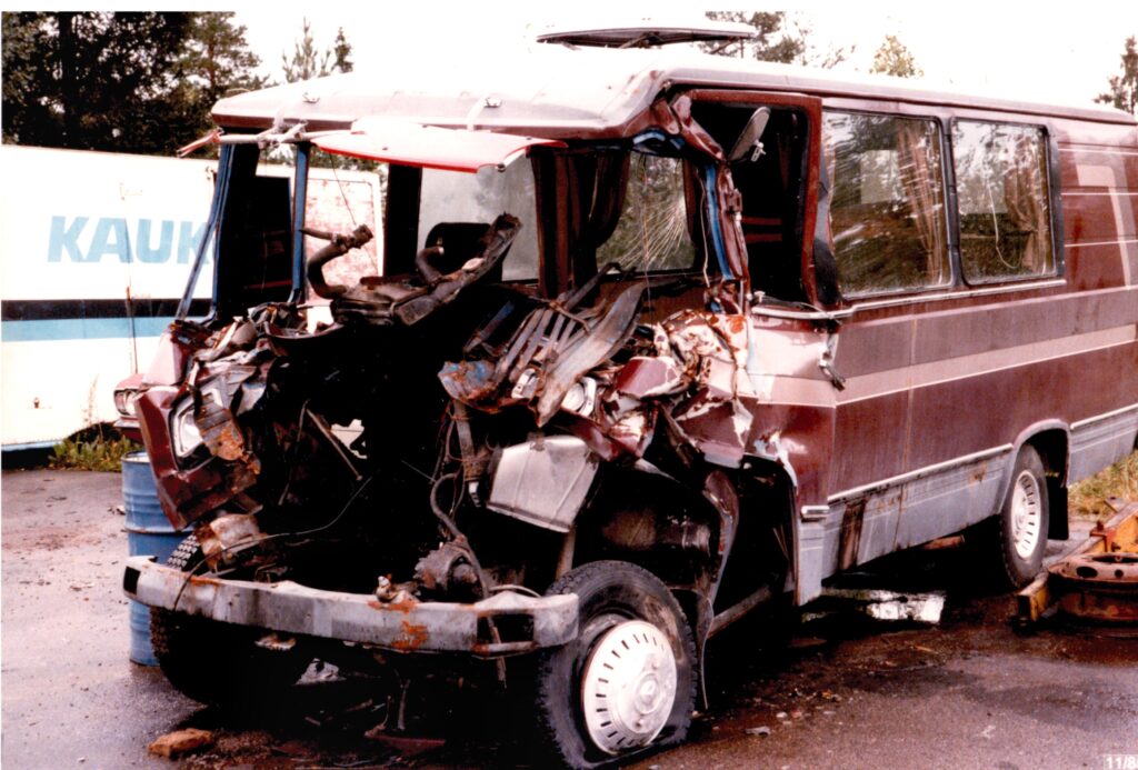 Nyt pitää tässä sen verran varoittaa, että seuraavat kuvat saattavat järkyttää. Mutta toteat, niinkuin monet ovat todenneet, että tuosta selviäminen on kyllä ihme. Se oli ihme. Auto oli alunperin ollut pakettiauto, mutta painon takia se luokiteltiin kuorma-autoksi ja sen takia siinä ei siis ollut edes turvavöitä. Minä isän kanssa rakensimme siitä 9-hengen bussin ja sen takia siinä ei esimerkiksi ollut kuljettajan takana olevaa takaseinää, joka olisi ollut kyllä melkoinen surmanloukku. Mutta miksi en lentänyt kaaressa ulos? Pienemmistäkin ikkunoista tai aukoista ihminen survoutuu äkkipysähdyksissä ulos pellolle. Autossa ei ollut ABSia, ei ollut Airbaggeja. Tuohon aikaan ei ollut kovinkaan yleistä, että olisi turvatyynyt. Loistoluokan S-sarjan Mersuun ne tuli 80-luvulla. Pakolliseksi ne tuli henkilöautoihin 1995 ja kuorma-autoihin 2006.
